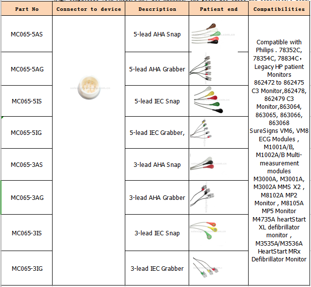 "Συμβατό με την Philips 78352C, 78354C, 78834C, παλαιότερες οθόνες ασθενών HP 862472 έως 862475 C3 Monitor, 862478, 862479 C3 Monitor, 863064, 863065, 863066, 863068 Μονάδες ECG SureSigns VM6, VM8, M1001A / B, M1002A / Μονάδες μέτρησης M3000A, M3001A, M3002A MMS X2, M8102A Παρακολούθηση MP2, Παρακολούθηση M8105A MP5 M4735A Παρακολούθηση απινιδωτών heartStart XL, M3535A / M3536A Παρακολούθηση απινιδωτών MRx HeartStart "