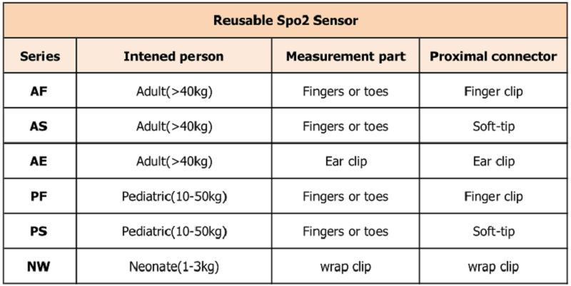 (PF & PS serial) Ο εξαιρετικά επαναχρησιμοποιούμενος αισθητήρας spo2 συνδέεται με το συμβατό παλμικό οξύμετρο για συνεχή μη επεμβατική παρακολούθηση του λειτουργικού κορεσμού οξυγόνου της αρτηριακής αιμοσφαιρίνης (SpO2) και του παλμικού ρυθμού (PR) για παιδιατρικούς ασθενείς βάρους 10-50kg